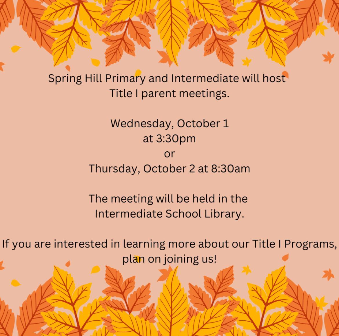 Spring Hill Primary and Intermediate will host Title I Parent Meetings on Wednesday, October 1, at 3:30 p.m. and Thursday, October 2, at 8:30 a.m. The meetings will be held in the Intermediate Library.